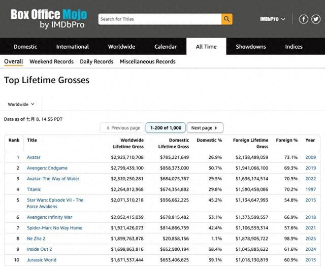 【TechWeb】7月9日消息,近日有传闻称,北美票房统计平台Box Office Mojo于2025年3月17日将《哪吒2》的票房数据从全球榜单中移除。